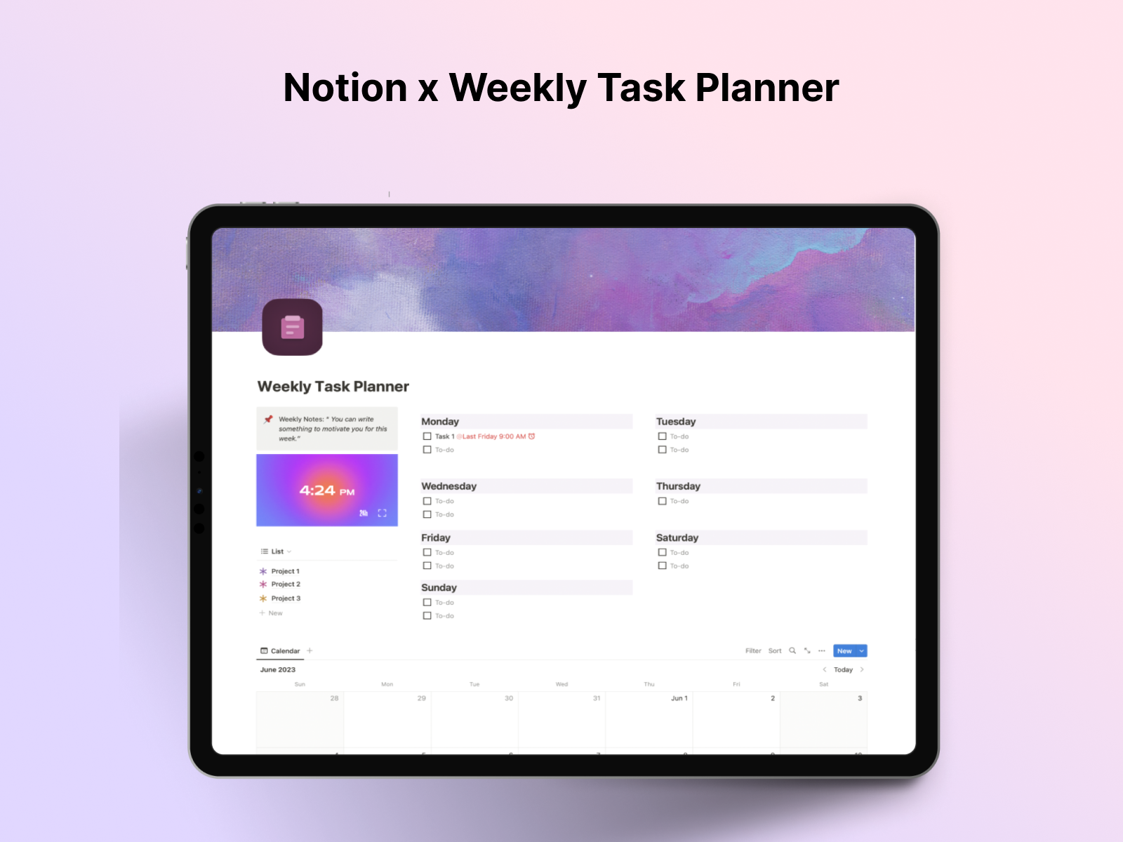 "Welcome to NazemNotion❤️🔥 Are you ready to level up your productivity and conquer your week like a boss? Introducing my Weekly Task Planner template for Notion—an all-in-one solution to help you stay organized, focused, and in control. With a comprehensive set of features, this template empowers you to seamlessly manage your daily tasks, track project progress, stay on top of your calendar, jot down important notes, and even embrace a custom aura clock for added mindfulness. Efficiency and flexibility are at the core of this template. Easily prioritize tasks, allocate time slots, and visualize your progress. Seamlessly navigate between daily and weekly views to ensure nothing slips through the cracks. Capture your thoughts, reflections, and ideas in the weekly note box, keeping everything in one centralized place. Crafted with meticulous attention to detail, the Weekly Task Planner offers a sleek and intuitive design, adaptable to your unique needs. Customize sections, labels, and colors to match your preferences and workflow, making it a perfect fit for your productivity journey. Join the community of high achievers who have harnessed the power of Notion templates to revolutionize their routines. Unleash your potential, take charge of your time, and thrive in all aspects of your life. Don't settle for an average week—embrace excellence and productivity. Get your hands on the Weekly Task Planner from NazemNotion and embark on a transformational journey towards success. Send your question at [email protected] will be more than happy to answer. ❤️🔥 I'm here to support you every step of the way. Let's make this week your most productive one yet! ❤️🔥"