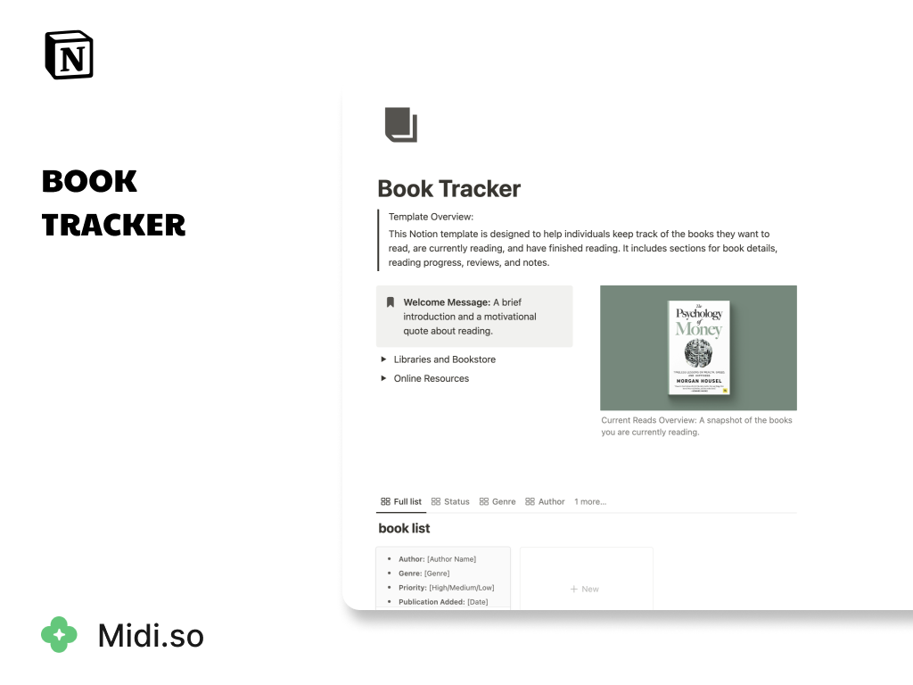 Enhance your reading experience with our Book Tracker Template. Perfect for book lovers and avid readers, this template helps you keep track of the books you've read, manage your reading list. Stay organized and make the most of your literary adventures. Dive into your next book with our Book Tracker Template. Track your reading progress and discover new favorites. Ready to take your reading to the next level? Download now and start tracking your books! And don't forget to explore more amazing templates at Midi Notion Studio.