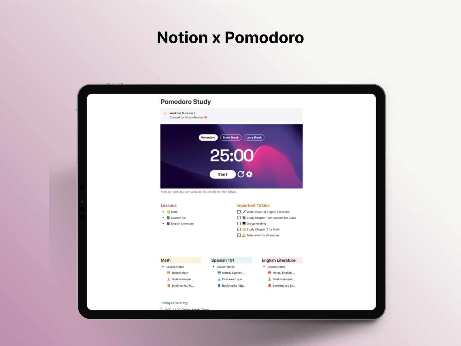 Introducing the "Pomodoro" Notion template—a productivity powerhouse designed to help you excel in your academic pursuits. This dynamic template combines the power of the Pomodoro Technique with essential features like custom widgets, comprehensive lessons, organized to-do lists, lecture notes and sources, and an intuitive academic calendar. Stay focused, manage your time effectively, and reach new heights of productivity with the "Pomodoro" template. Elevate your academic journey today! Send your question at [email protected] will be more than happy to answer. ❤️🔥