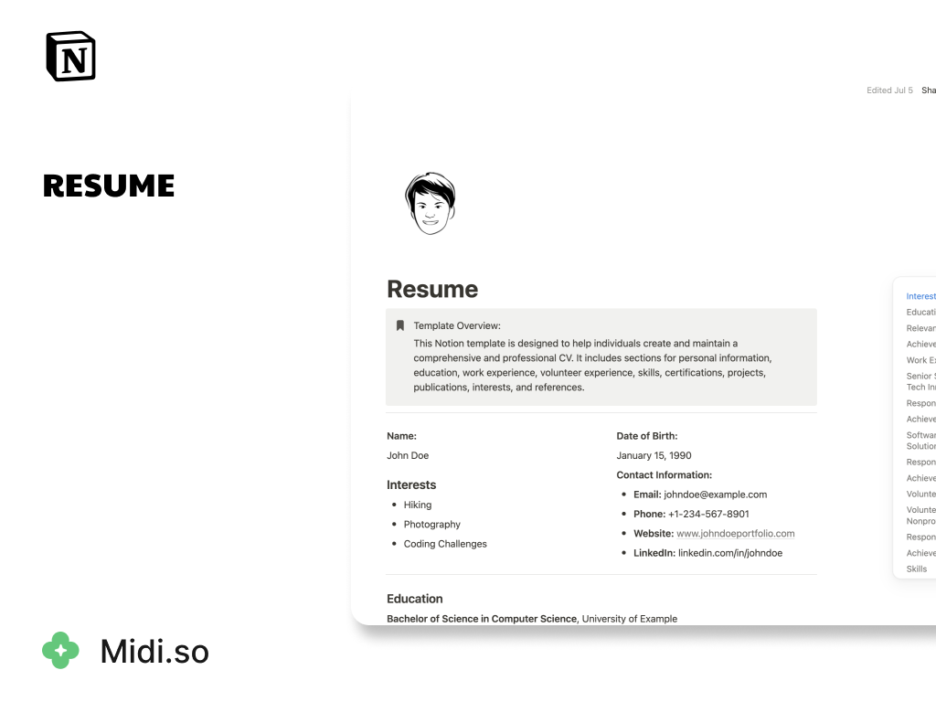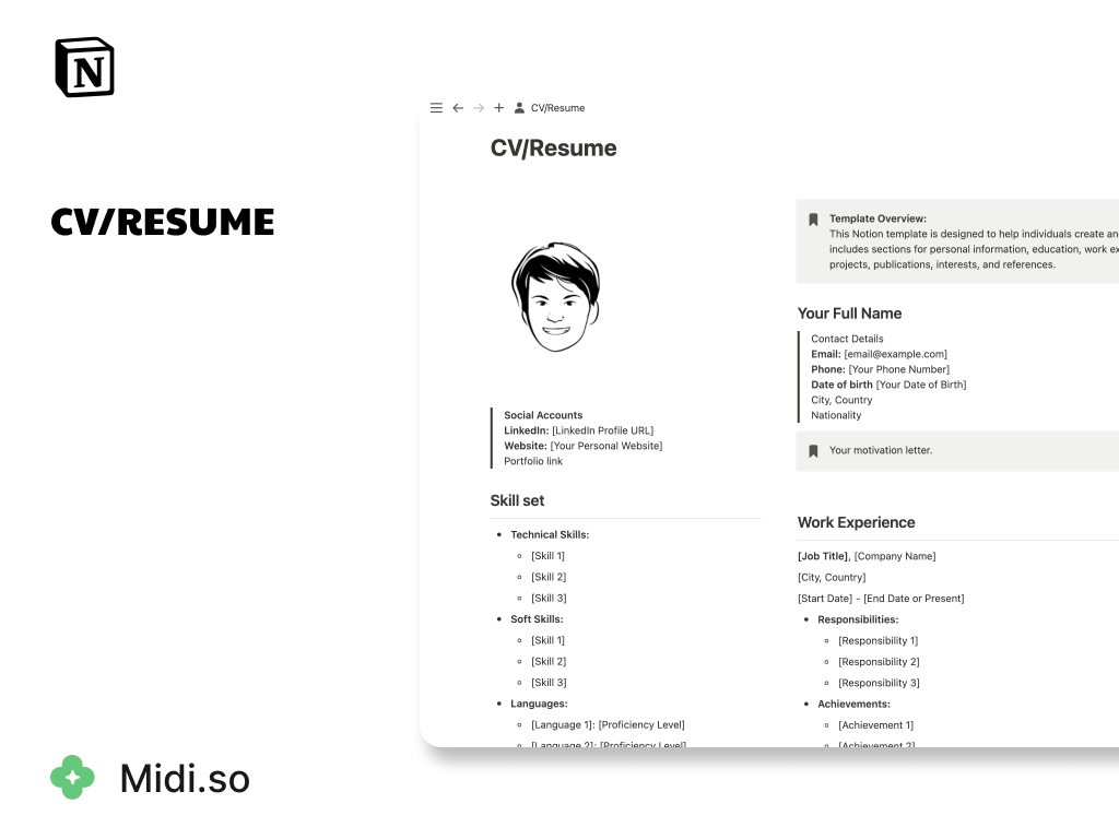 Make a strong impression with our professionally designed Resume Template. Tailored to help you highlight your skills, experience, and achievements, this template ensures your resume stands out to potential employers. Perfect for any industry, our template is easy to customize and adapt to your needs. What is included: Work experienceSkill setEducationVolunteer ProjectsCertificationsPublicationsReferencesInterestContactGet noticed and land your dream job with our Resume Template. Create a polished and professional resume that showcases your strengths. Ready to make your next career move? Download now and start crafting your standout resume! Plus, explore more fantastic templates at Midi Notion Studio.