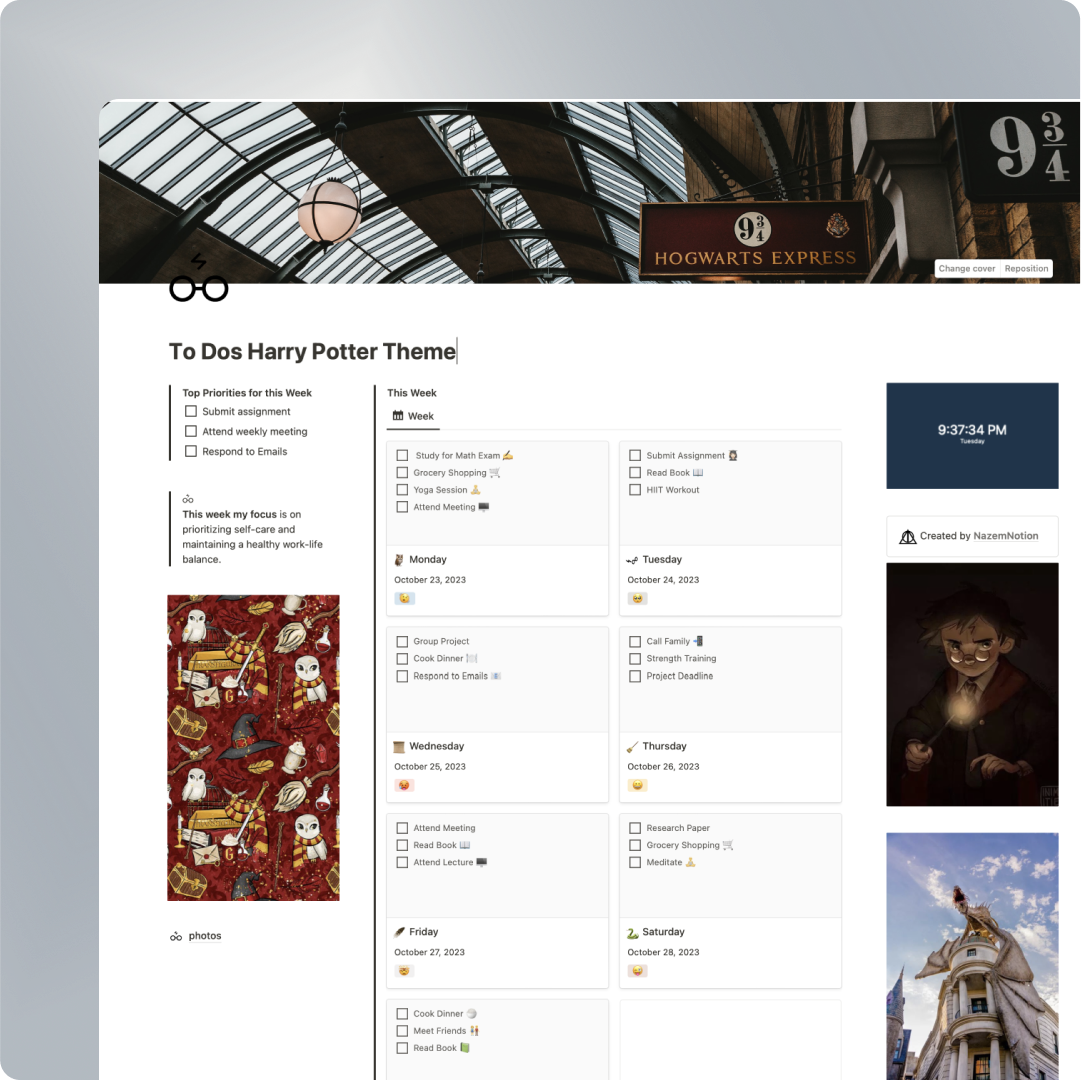 "Unlock your magical potential and organize your wizardly affairs with the 'Obligations & Incantations' To Dos Notion template 🪄✨. This enchanting template is expertly crafted to assist you in managing your mystical tasks, orchestrating your daily incantations 📜🔮, and nurturing your enchanted habits 🌿🪙. Whether you're a diligent Hogwarts student 🏰🧙, a dedicated wizard at the Ministry of Magic 🏢🧳, or an aspiring sorcerer seeking personal growth, this template conjures a spellbinding framework to keep you enchanted and motivated on your journey through the wizarding world 🚂🦉🌌!" Send your question via messenger🦉 to [email protected]. I will be very happy to answer. ❤️🔥 "Until next time, may your path be lit by the Lumos of adventure and your journey be as magical as a Marauder's Map. Mischief managed, and farewell!" 🌟🗺️🔮✨