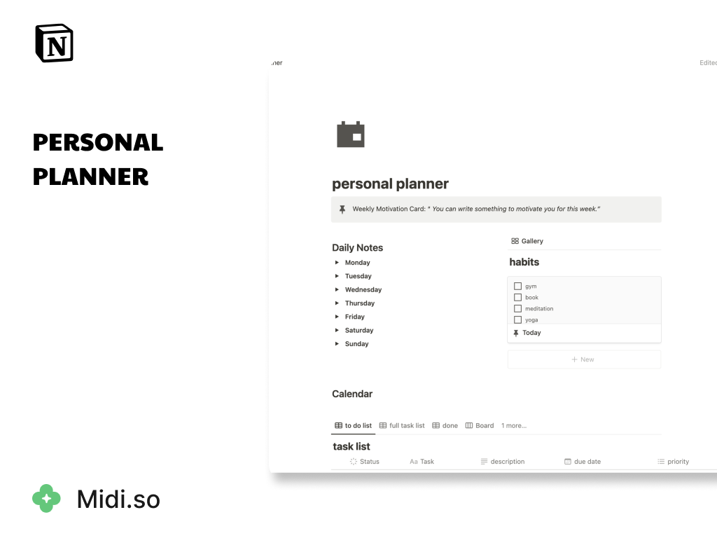 Stay organized and on top of your life with our Personal Planner Template. Whether you're managing your daily schedule, tracking your to-dos, this template has everything you need to keep your life in order. Make every day count with our Personal Planner Template. Achieve more and stress less by keeping all your important tasks and goals in one place. Ready to take charge of your schedule? Download now and start planning your success! And be sure to explore other wonderful templates available at Midi Notion Studio.