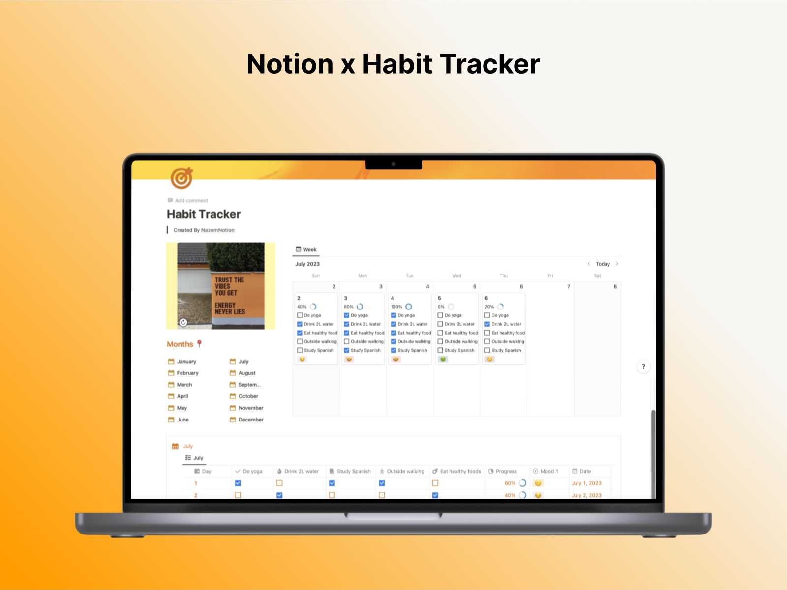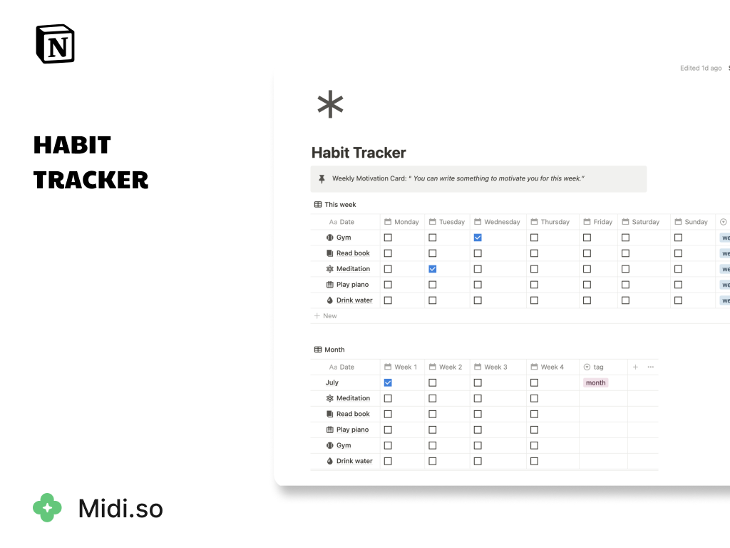 Are you looking to build and maintain new habits that enhance your productivity, wellness, and overall lifestyle? Our Habit Tracker Template is designed to help you do just that. With an intuitive and visually appealing layout, this template makes it easy to track your daily, weekly, and monthly habits. Transform your routine and start building better habits today with our Habit Tracker Template. Take control of your personal growth journey and see the progress in real-time. Ready to make a change? Download now and get started! And don’t forget to check out more amazing templates at Midi Notion Studio.