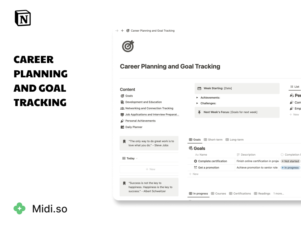 Take charge of your career with our Career Planning and Goal Tracker Template. This comprehensive tool is designed to help you set professional goals, track your progress, and plan your career development effectively. Whether you're looking to climb the corporate ladder or switch careers, this template will guide you every step of the way. What is included: Personal AchievementsGoalsDevelopment and Education trackingJob application and interview preparationsNetworking and connection trackingToday’s overview Achieve your career aspirations with our Career Planning and Goal Tracker Template. Stay focused, motivated, and organized as you work towards your professional goals. Ready to advance your career? Download now and start planning your future! And don't forget to explore more fantastic templates at Midi Notion Studio.