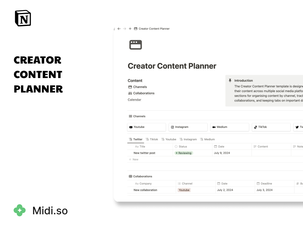 Organize and streamline your content creation process with our Creator Content Planner Template. Ideal for bloggers, YouTubers, influencers, and creatives, this template helps you plan, schedule, and track your content across multiple platforms. Stay on top of your content strategy and never miss a deadline again. What is included: ChannelsContent schedule for each channelCollaborationsCalendar Elevate your content creation game with our Creator Content Planner Template. Keep your ideas organized and your schedule on track. Ready to create consistently great content? Download now and start planning like a pro! And be sure to check out more incredible templates at Midi Notion Studio.