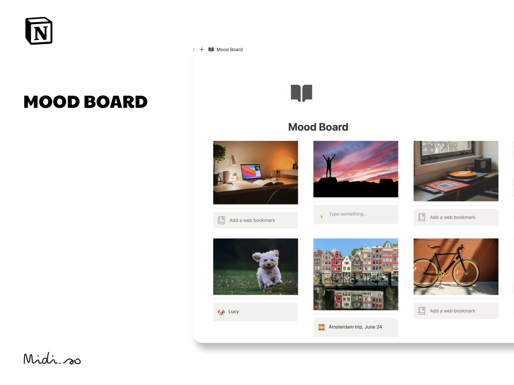 Spark your creativity and visualize your ideas with our Mood Board Template. Download now and start creating your perfect mood board! And don’t forget to check out more delightful templates at Midi Notion Studio.