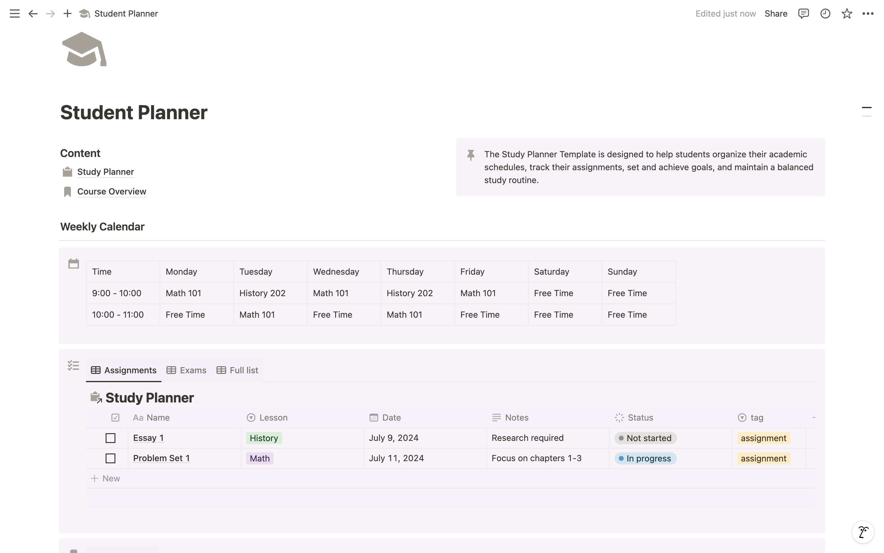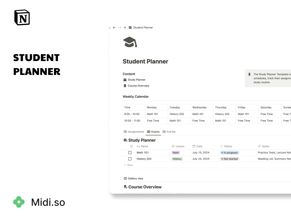 Excel in your academic journey with our Student Planner Template. Perfect for students of all ages, this template helps you keep track of assignments, manage your study schedule, and stay organized throughout the school year. With dedicated sections for courses, assignments, and exam preparation, you'll have everything you need to succeed. What is included: Weekly CalendarStudy PlannerCourse Overview Stay ahead in your studies and manage your time like a pro with our Student Planner Template. Make studying more efficient and stress-free. Ready to boost your academic performance? Download now and start planning your way to success! Plus, discover more helpful templates at Midi Notion Studio.