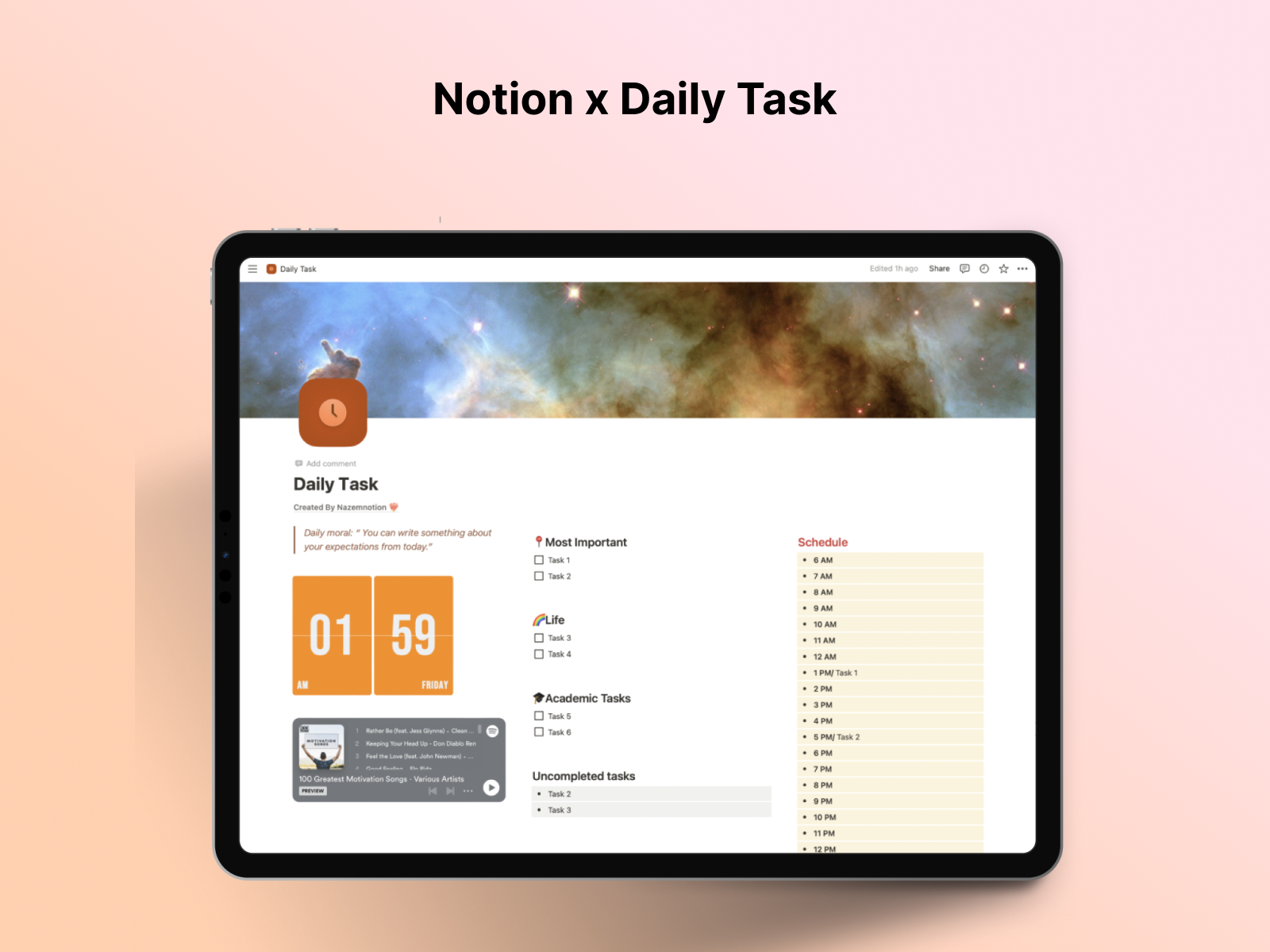 "Welcome to NazemNotion❤️🔥 Ready to supercharge your productivity and make each day count? My Free Daily Task Template for Notion is your ultimate companion on the journey to achieving your dreams. With meticulous design and thoughtful features, this template empowers you to organize and track your daily tasks with ease. Stay focused and motivated as you set your daily goals, prioritize your tasks, and mark off completed items. Effortlessly manage your to-do list, ensuring nothing falls through the cracks. Experience the satisfaction of ticking off tasks and gaining momentum towards your larger goals. Designed for efficiency and adaptability, my Daily Task Template offers customizable sections and intuitive layouts. Tailor it to your unique workflow and preferences, making it your personal productivity oasis. Stay organized, eliminate overwhelm, and reclaim your time. Join the ranks of individuals who have transformed their daily routines and unlocked their true potential with our Notion templates. Start your journey towards a more productive and fulfilling life today. Invest in yourself, seize each day, and watch your dreams become a reality. Don't wait any longer—grab your Daily Task Template from NazemNotion and embark on a journey of productivity and success. Your most productive self awaits!" Send your question at [email protected] I will be more than happy to answer. ❤️🔥