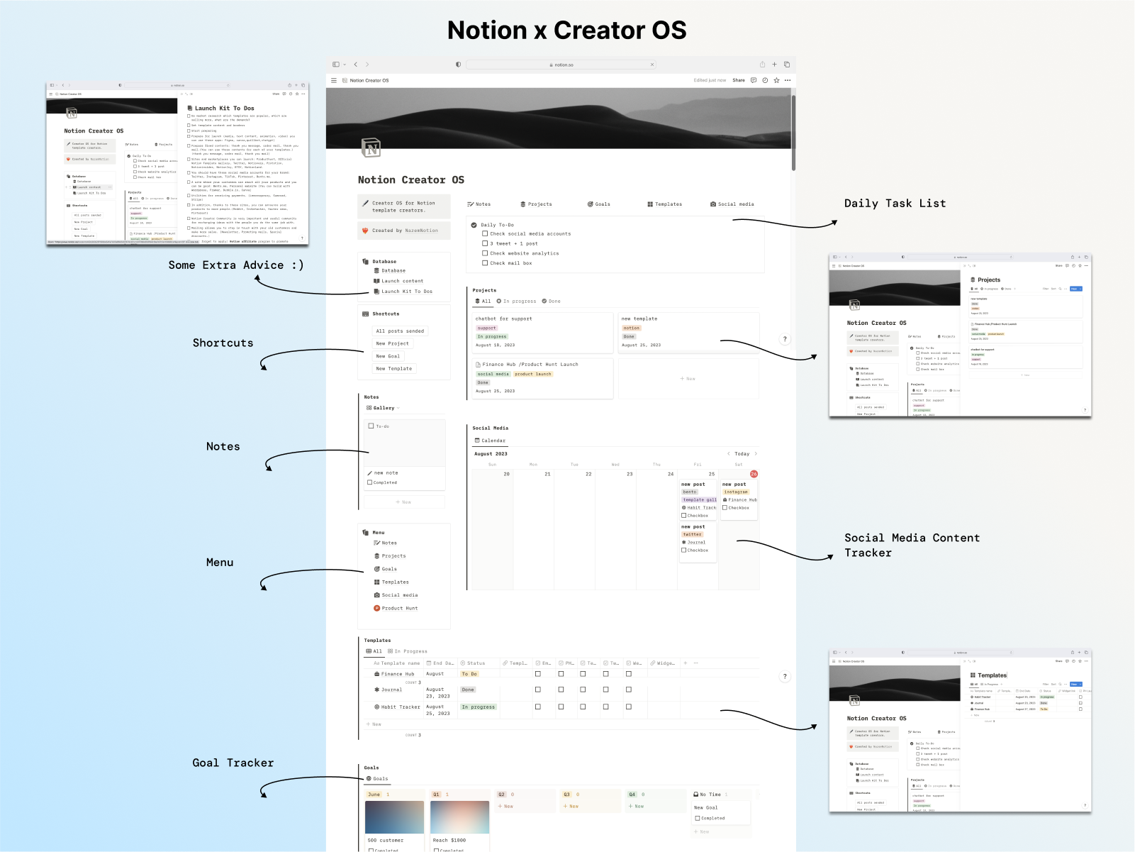 Introducing the "Notion Creator OS" Template: Are you a Notion template creator looking to streamline your workflow and maximize your productivity? Look no further than the "Notion Creator OS" template, meticulously designed to be your central hub for managing every aspect of your template creation journey. Overview: The "Notion Creator OS" template is your ultimate tool for simplifying and optimizing your template creation process. It empowers you to efficiently track and manage various aspects of your work, ultimately saving you valuable time. Here's what this template has to offer: 1. Template Content Management: 2. Launch Management: 3. Daily Task Tracking: 4. Project and Goal Tracking: Why Choose the "Notion Creator OS" Template? - Efficiency - Organization - Productivity - Guidance Whether you're a seasoned template creator or just starting your journey, the "Notion Creator OS" template is your all-in-one solution for enhancing your workflow and ensuring the success of your template creations. Simplify your process, boost your productivity, and reach your template creation goals with ease. Get started today and take control of your Notion template creator journey!